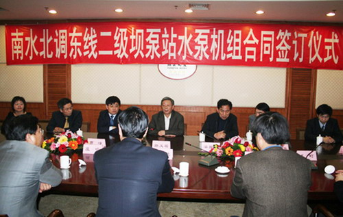 新聞中心 3月12日,南水北調(diào)東線一期工程二級壩泵站簽字儀式在山東省濟南頤正大廈隆重舉行;山東省水利廳領導、淄博市領導及荏原博泵李正民副總帶隊參加了簽字儀式。荏原博泵在南水北調(diào)主線泵站中標,標志著我公司大型泵的制造將有新的突破。